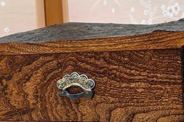 また、箪笥装飾の金具についても「手打ち金具」 というものがあって、下絵→タガネによる彫り→裏から打ち出すことで立体的に仕上げる伝統技法があるんです。