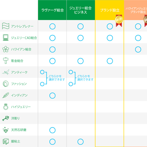 ブランド立ち上げに対応したセットコースで最も人気が高い、ジュエリーブランド設立コースを軸に比較されるのがおすすめです。
