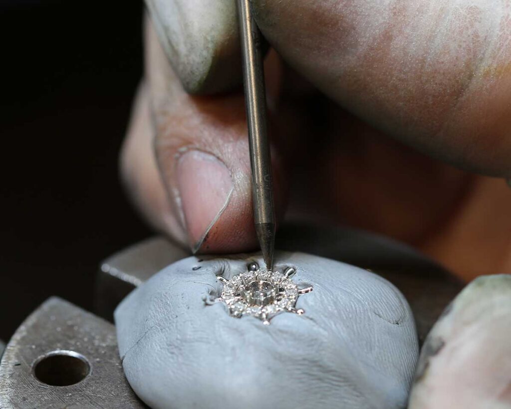 金属を削り取るのではなく、タガネの先端で地金を「移動させる」ように扱います。宝石を留めるための爪(つめ)を地金から押し出したり、石座の縁を伏せ込んで整えたりして、宝石を美しく確実に固定します。