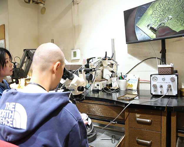 洋彫りコースで、講師があなたのタガネの状態をチェックしながら、刃の付け方、グレーバーハンドピースの使い方、文字の下書きの仕方など高度な洋彫り技術を正しい技法で習得できるよう、段階的に指導します。