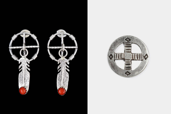 ナバホ族は、伝統的なシルバー細工とターコイズ(トルコ石)を組み合わせる大胆なスタイルで、四方位を示す十字や円のモチーフを力強く表現します。