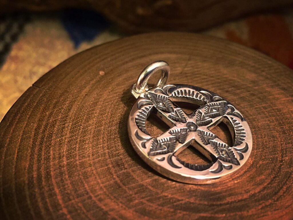 メディスンホイールのジュエリーにおいて、スタンプワークは非常に重要な役割を果たします。 円や十字を中心に放射状の模様を打ち込むことで、四方位や太陽、風、山、星など、 自然や宇宙の象徴を織り交ぜた装飾が施されます。